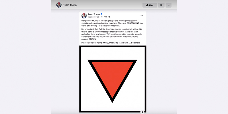 Facebook ha rimosso una pubblicità del comitato elettorale di Trump che usava un simbolo riconducibile ai campi di concentramento nazisti. La pubblicità era un post in cui si parlava di «Pericolosi gruppi di estrema sinistra» che «stanno distruggendo le nostre città» e si chiedeva di firmare una petizione per sostenere la proposta di Trump di dichiarare il gruppo di attivisti ANTIFA (Chi sono?) un’organizzazione terroristica.