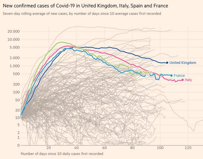 Il Regno Unito è il paese europeo che continua a registrare in media più contagi ogni giorno: sono oltre 1.300, contro i circa 300 dell’Italia. Ed è anche quello in cui sono stati confermati più casi positivi (300.469) e più decessi (42.288) dall’inizio dell’epidemia. Le misure di lockdown ancora in vigore sono più rigide di quelle degli altri paesi: i pub e i ristoranti, ma anche i parrucchieri, sono ancora chiusi, a differenza di quanto succede ormai da diverse settimane in Italia, Francia e Spagna, gli altri paesi europei più colpiti. Il governo raccomanda ancora di stare a casa il più possibile, e i negozi non essenziali hanno riaperto soltanto il 15 giugno. Alcune scuole invece hanno riaperto o riapriranno a luglio, a differenza di quanto avviene in Italia. La curva dei contagi del Regno Unito è scesa visibilmente meno rispetto a quella degli altri paesi europei.