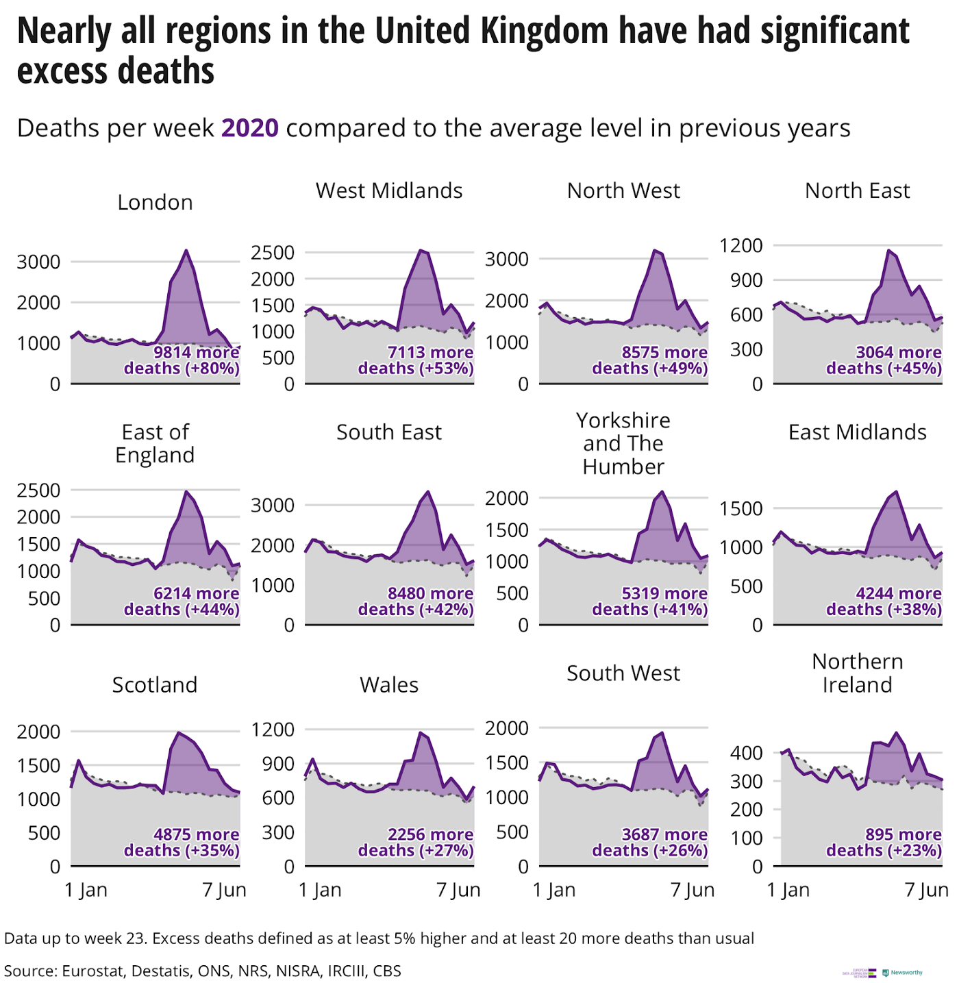 Una notevole eccezione è rappresentata dal Regno Unito: qui il coronavirus si è diffuso in maniera talmente uniforme che tutte le micro-regioni tranne una hanno registrato un aumento significativo delle morti in eccesso. Gli ultimi dati raccolti risalgono al 7 giugno.