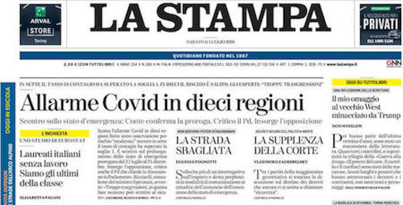 L’annuncio – successivamente ritirato – del presidente del Consiglio Giuseppe Conte sulla possibilità che lo stato di emergenza sia esteso fino a fine anno occupa gran parte delle prime pagine nazionali, che danno spazio anche alle barriere del Mose che sono state alzate ieri a Venezia, e alla trattativa tra governo e Autostrade, che oggi si incontreranno. Sui quotidiani sportivi, le attenzioni sono perlopiù per Juventus-Atalanta di stasera.