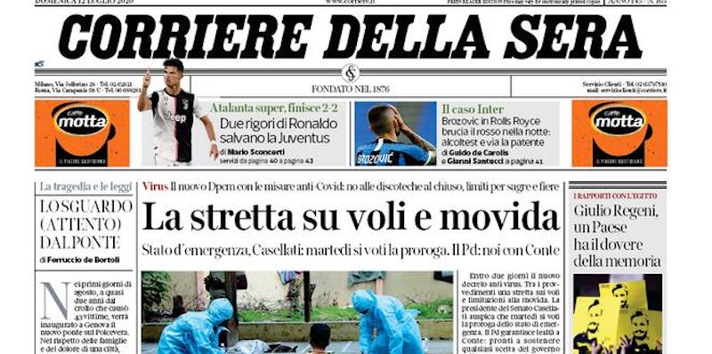 Si continua a parlare della probabile proroga allo stato di emergenza, su diverse prime pagine di oggi, in diversi casi pretestuosamente. Altri quotidiani aprono invece sulle trattative tra governo e Autostrade sulle concessioni, e quasi ovunque c’è una foto della Juventus, che ieri sera ha pareggiato per 2 a 2 con l’Atalanta avvicinandosi di molto alla vittoria del campionato.
