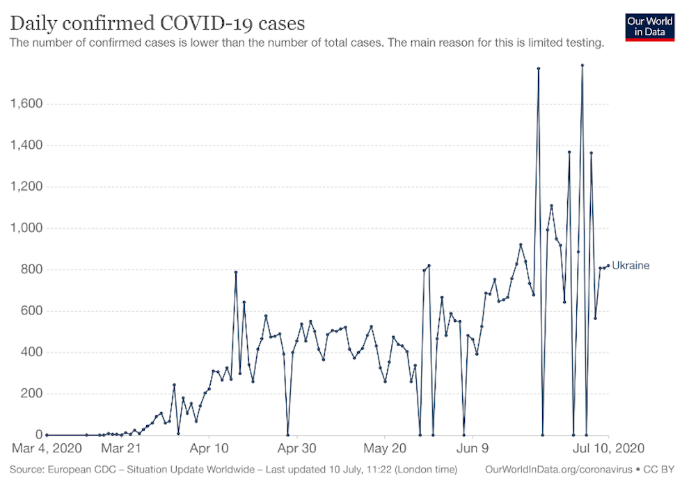 Il numero di casi giornalieri confermati in Ucraina, da inizio marzo al 10 luglio. Fonte: ourworldindata.org