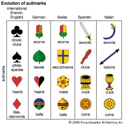 Contemporaneamente la Francia aveva stabilizzato i 4 semi del suo mazzo, che di lì a poco sarebbe diventato il più usato in tutto il mondo. Ha 52 carte e 4 semi, coeurs (cuori), piques (picche), carreaux (quadri), and trefles (fiori); i trefles potrebbero derivare dalle ghiande e le picche dalle foglie delle carte tedesche. Le carte francesi ebbero successo grazie alla decisione di usare solo due colori, il rosso e il nero, e alla facilità di esecuzione di simboli e disegni; questo le rese ancora più facili ed economiche da produrre, usando semplici stampini anziché matrici intagliate a mano. Fu così che le carte francesi soppiantarono quelle tedesche.
