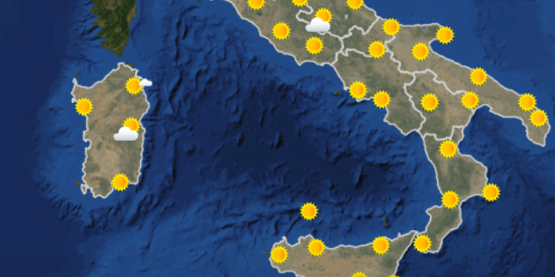 Secondo le previsioni del Servizio meteorologico dell’Aeronautica Militare, domani, lunedì 20 luglio, continuerà il bel tempo dei giorni scorsi su tutta Italia: stabile e soleggiato ovunque e senza precipitazioni. Si avranno nubi soltanto lungo l’arco alpino e in Liguria. Le temperature minime per l’inizio della settimana saranno in rialzo al Centro e stabili altrove, mentre le massime saranno in aumento in tutto il paese, soprattutto nelle regioni adriatiche. Ci saranno venti deboli e mari generalmente poco mossi da Nord a Sud.