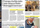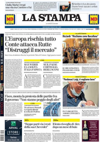 La riunione del Consiglio Europeo e la trattativa fra i vari paesi per trovare un accordo sugli aiuti economici per affrontare la crisi provocata dalla pandemia da coronavirus sono in apertura su tutti i giornali di oggi. Le altre notizie sulle prime pagine sono le scadenze fiscali dei prossimi giorni, la morte di Giulia Maria Crespi, fondatrice del Fondo Ambiente Italiano, i dati sulla diffusione dei contagi in leggera risalita negli ultimi giorni, mentre i giornali sportivi commentano il pareggio di ieri sera fra la Roma e l’Inter, che rimane seconda a cinque punti di distacco dalla Juventus.