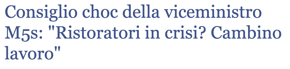 Un esempio facile e che trova decine di esempi ogni giorno sono i virgolettati inventati, che non si limitano a sintetizzare un concetto ma spesso lo stravolgono pur di renderlo più efficace e più forte. Un caso recente riguarda Laura Castelli, sottosegretaria all’Economia, che ha detto: «Questa crisi ha spostato la domanda e l’offerta. Le persone hanno cambiato il modo di vivere e bisogna tenerne conto. Bisogna aiutare le imprese e gli imprenditori creativi a muoversi sui nuovi business che sono nati in questo periodo. Sono processi di lungo periodo, certo, ma se una persona decide di non andare più a sedersi al ristorante bisogna aiutare l’imprenditore a fare magari un’altra attività e a non perdere l’occupazione e va sostenuto anche nella sua creatività: potrebbe aver visto un nuovo business da affrontare». Questo concetto piuttosto articolato è stato riassunto dai titoli così.