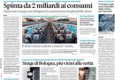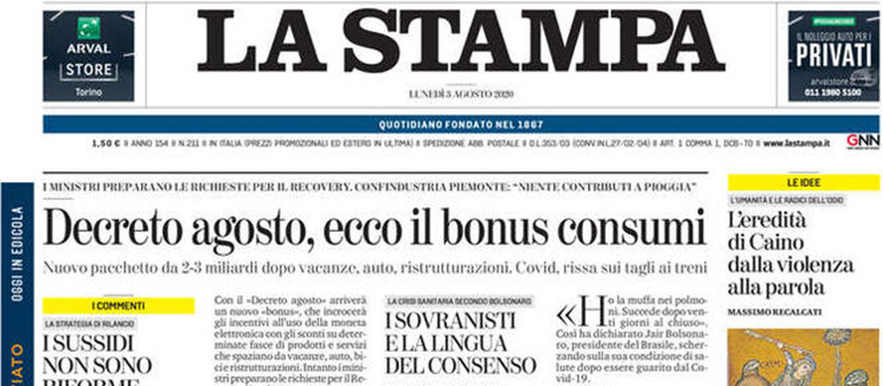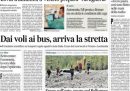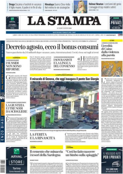 I giornali di oggi dedicano l’apertura a notizie diverse: l’inaugurazione del nuovo ponte di Genova, le misure economiche che dovrebbero essere inserite in un nuovo decreto per rilanciare l’economia, le limitazioni alle presenze a bordo dei mezzi di trasporto pubblici per contrastare l’epidemia da coronavirus, le prossime iniziative politiche di Lega e Fratelli d’Italia, e le discussioni sulla gestione degli arrivi di migranti. I giornali sportivi iniziano a occuparsi dei possibili movimenti degli allenatori in vista del prossimo campionato.