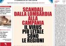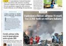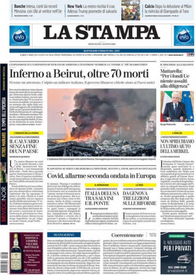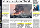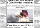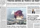 Ci sono notizie diverse in apertura sui giornali di oggi: alcuni titolano sull’esplosione al porto di Beirut e dei primi bilanci di morti e feriti, altri si occupano del discorso del presidente della Repubblica Mattarella ai presidenti delle Regioni in occasione del cinquantenario dell’istituzione delle regioni a statuto ordinario. Il Giornale e la Verità criticano le decisioni del governo sui servizi segreti, il Manifesto si occupa del rapporto di Legambiente sulle spiagge italiane, Libero segue la vicenda del processo a Matteo Salvini per il blocco della nave Open Arms, e i giornali sportivi presentano la ripresa delle coppe europee con la partita di stasera dell’Inter in Europa League.