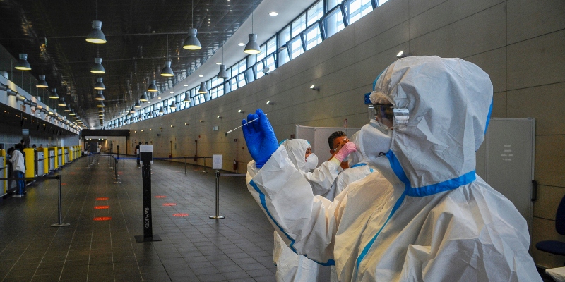 Tamponi ai passeggeri provenienti dalla Spagna all'aeroporto di Torino Caselle, il 17 luglio 2020 (ANSA/ EDOARDO SISMONDI)