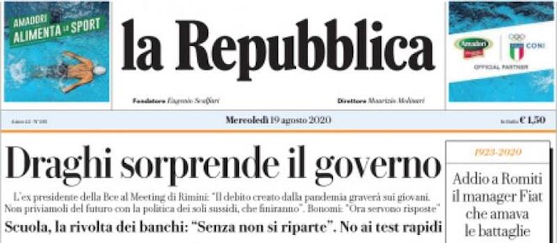 Il discorso pronunciato da Mario Draghi, ex governatore della Banca Centrale Europea, all’annuale incontro estivo organizzato da Comunione e Liberazione a Rimini, si prende buona parte dei titoli di prima pagina di oggi; insieme alla morte di Cesare Romiti, agli sviluppi dell’epidemia e ai rapporti politici tra PD e M5S.