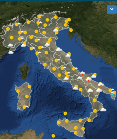 Le previsioni meteo per domani dicono che sarà una bella giornata in tutto il paese a eccezione di Puglia e Molise, dove soprattutto la mattina ci saranno piogge e temporali. La mattina il cielo sarà nuvoloso in Liguria, Emilia-Romagna, nelle Marche, in Basilicata e Campania. Nel pomeriggio il tempo migliorerà ovunque tranne nella Puglia meridionale, dove continuerà a piovere, e smetterà durante la sera.