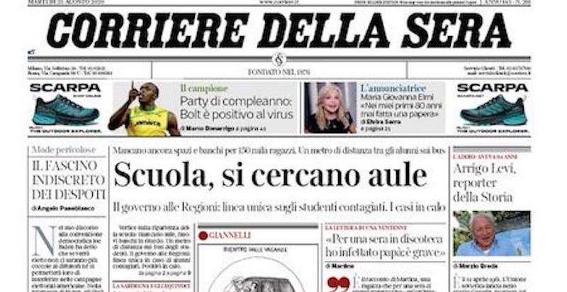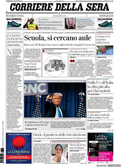 Sulle prime pagine dei quotidiani di oggi si parla della prima serata della convention del Partito Repubblicano statunitense, degli ultimi sviluppi del piano del governo per riaprire le scuole del governo, della questione dei tamponi per il coronavirus per chi rientra dall’estero e in alcune regioni con maggiori contagi, come la Sardegna. C’è poi la notizia della conferma dell’avvelenamento dell’oppositore politico russo Alexei Navalny, insieme ad alcuni ricordi del giornalista Arrigo Levi, morto a 94 anni. Sui giornali sportivi si parla principalmente di due allenatori, uno al suo primo giorno e uno potenzialmente all’ultimo: Andrea Pirlo della Juventus e Antonio Conte dell’Inter.