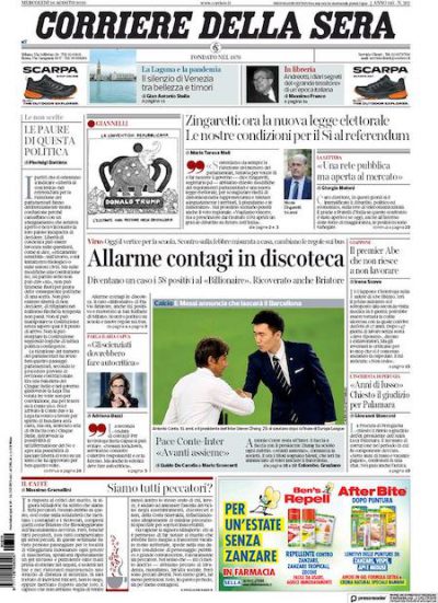 Sulle prime pagine dei giornali di oggi si parla del referendum sul numero dei parlamentari, del focolaio scoperto alla discoteca Billionaire di Porto Cervo (Sardegna), quella di Flavio Briatore, e dello scontro tra governo e regioni sulle regole da adottare per l’inizio dell’anno scolastico. Sui giornali sportivi si parla soprattutto di Lionel Messi e dalla sua volontà di lasciare l’unica squadra per cui ha giocato da professionista, il Barcellona, e dell’accordo che porterà Antonio Conte a continuare a essere l’allenatore dell’Inter.