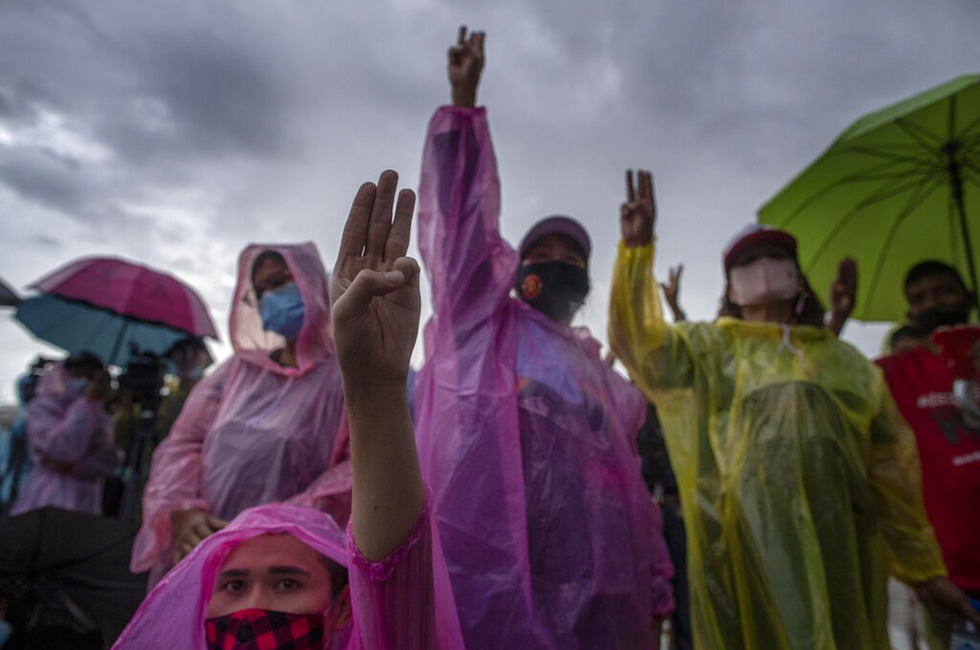 Il saluto a tre dita con indice, medio e anulare alzati della saga The Hunger Games, diventata uno dei riferimenti culturali delle proteste, Bangkok, 23 agosto 2020 (AP Photo/Gemunu Amarasinghe)