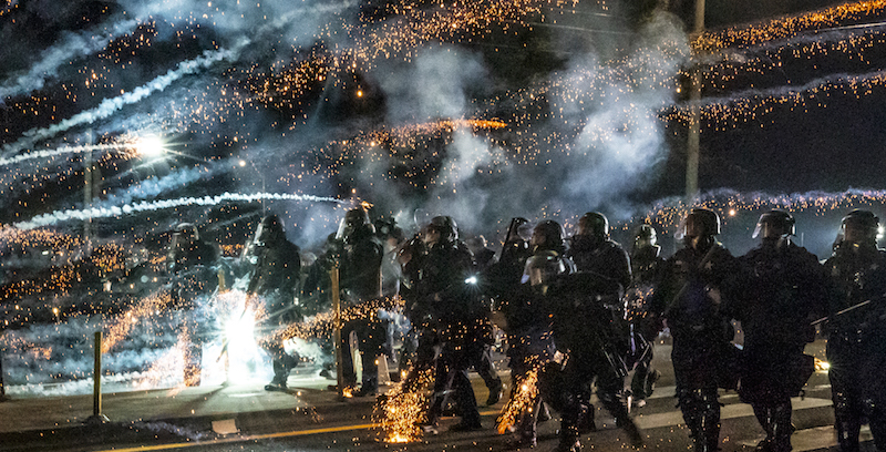 Delle proteste a Portland si era parlato molto durante l’estate perché la repressione della polizia era diventata molto violenta, con metodi al limite della legalità. Non erano agenti cittadini, ma squadre speciali che rispondevano al governo federale statunitense inviate dal presidente Donald Trump: non si erano opposti alla loro presenza solo attivisti e movimenti anti-razzisti ma anche le autorità locali. Una delle foto più condivise di quelle proteste era quella di una donna nuda seduta di spalle in mezzo a una strada, con le gambe aperte e uno schieramento di poliziotti in tenuta antisommossa davanti. La manifestante, di cui non si conosce l’identità, venne soprannominata Naked Athena, cioè “Atena nuda”.