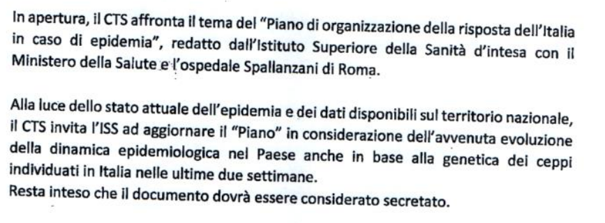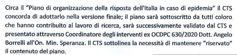 Il piano riemerge dopo una decina di giorni: nel verbale della riunione del 2 marzo, il CTS «concorda di adottarlo nella versione finale», e viene sottolineata la necessità che il documento rimanga «secretato». Con tutta probabilità il CTS intendeva invitare i suoi membri e chiunque leggesse il verbale alla riservatezza, dato che per la legge italiana l’unico organo che può imporre il segreto di stato è la presidenza del Consiglio.
