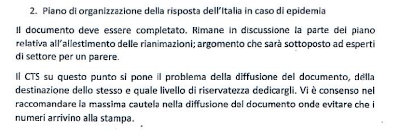L’esistenza di un piano viene citata la prima volta nel verbale dell’incontro tenuto il 24 febbraio, pochi giorni dopo la scoperta dei primi casi di coronavirus in Lombardia e Veneto. Il verbale parla di un «piano di organizzazione della risposta dell’Italia in caso di epidemia» e si specifica che «deve essere completato», con particolare attenzione all’«allestimento delle rianimazioni», cioè dei reparti di ospedale che avrebbero dovuto gestire i casi più gravi. Il verbale si chiude con il «consenso» fra i membri del CTS affinché il piano non venga girato ai giornali.