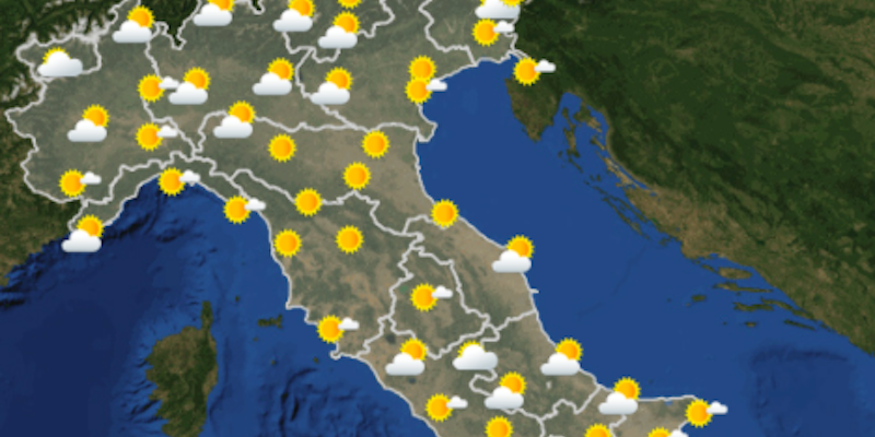 Le previsioni meteo per sabato dicono che sarà una giornata un po’ soleggiata e un po’ nuvolosa, soprattutto al Centro-Sud. Di mattina è prevista pioggia solamente in Sardegna e Sicilia e sarà nuvoloso al Nord, poi di pomeriggio ci saranno schiarite un po’ ovunque tranne che sulle isole maggiori. Infine di sera e di notte la situazione rimarrà stazionaria, con pioggia prevista nella zona di Messina. Le temperature massime aumenteranno, soprattutto al Centro dove arriveranno oltre i 30 gradi.
