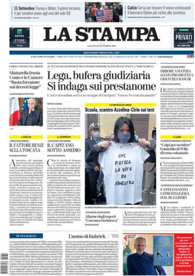La maggior parte dei giornali di oggi si occupa in apertura dell’indagine sulla Film Commission lombarda per la quale sono stati arrestati tre commercialisti vicini alla Lega e dei possibili sviluppi che potrebbero riguardare il partito; altri giornali aprono sulla firma alla legge di conversione del decreto sulle semplificazioni del presidente della Repubblica Mattarella, che ha però richiamato governo e parlamento a non inserire nei decreti legge norme troppo eterogenee. Il Manifesto e il Resto del Carlino si occupano invece della riapertura delle scuole, e Avvenire segue l’inchiesta sul delitto di Colleferro per il quale i sospettati sono ora accusati di omicidio volontario.