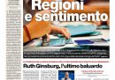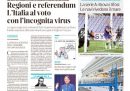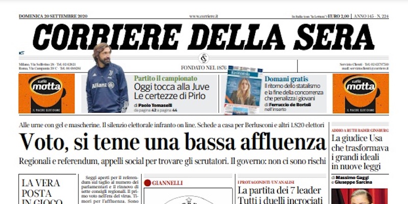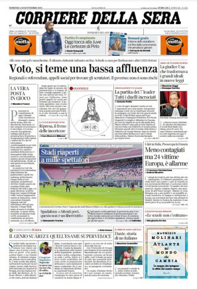 Le prime pagine dei quotidiani di oggi, domenica 20 settembre 2020, aprono con le elezioni di questo fine settimana, tra i timori per gli assembramenti ai seggi elettorali e le previsioni di una bassa affluenza. Tra oggi e domani si vota per il referendum costituzionale sulla riduzione di un terzo del numero dei parlamentari di Camera e Senato, in sette regioni anche per il rinnovo dei presidenti e delle giunte regionali e per le amministrative in quasi mille comuni, tra i quali Venezia, Reggio Calabria, Trento, Bolzano e Arezzo. Si parla poi della morte della giudice della Corte Suprema statunitense Ruth Bader Ginsburg e della partenza della nuova Serie A con i primi spettatori allo stadio, visti sabato pomeriggio al Meazza di Milano.