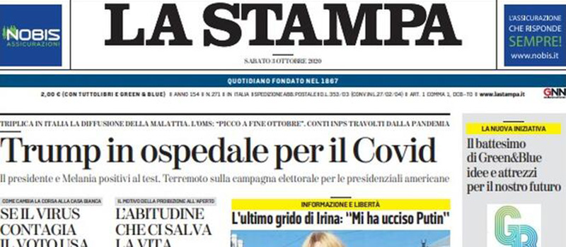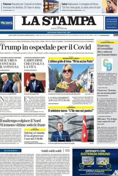 Le notizie principali in apertura sui giornali di oggi sono la positività al coronavirus del presidente degli Stati Uniti Donald Trump, ricoverato ieri in ospedale, e della moglie Melania, le nuove misure per contrastare la diffusione dell’epidemia in Italia dopo l’aumento dei positivi rilevato negli ultimi due giorni, con l’obbligo di indossare la mascherina anche all’aperto in diverse regioni, e il processo all’ex ministro dell’Interno Salvini per la vicenda dei migranti bloccati sulla nave Gregoretti, che inizia oggi a Catania.