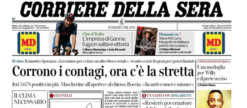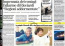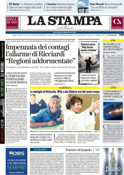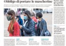Tutti i giornali di oggi si occupano in apertura del nuovo decreto legge che proroga lo stato di emergenza fino al 31 gennaio 2021, stabilisce l’obbligo di indossare le mascherine anche all’aperto e consente alle regioni di modificare le limitazioni solo in senso più restrittivo rispetto a quanto indicato dal governo, e delle preoccupazioni per l’aumento dei casi di positività al coronavirus registrati ieri, oltre 3.600 in più rispetto al giorno precedente.