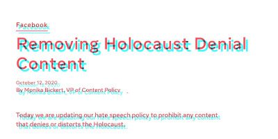 Il social network Facebook ha annunciato di aver aggiornato il suo regolamento riguardante l’incitamento all’odio con il divieto di pubblicazione di qualsiasi contenuto che neghi l’Olocausto o ne alteri i fatti. Facebook ha motivato l’introduzione di queste nuove politiche alla luce di un «documentato aumento dell’antisemitismo a livello globale e di un allarmante livello di ignoranza sull’Olocausto, soprattutto tra i giovani». È stato specificato che l’applicazione delle nuove politiche non potrà avvenire «dall’oggi al domani», e che ci vorrà del tempo prima che i sistemi di monitoraggio e rimozione del social network entrino in funzione correttamente e a pieno regime. Nel frattempo, chi effettuerà ricerche sull’argomento verrà indirizzato verso «fonti autorevoli».