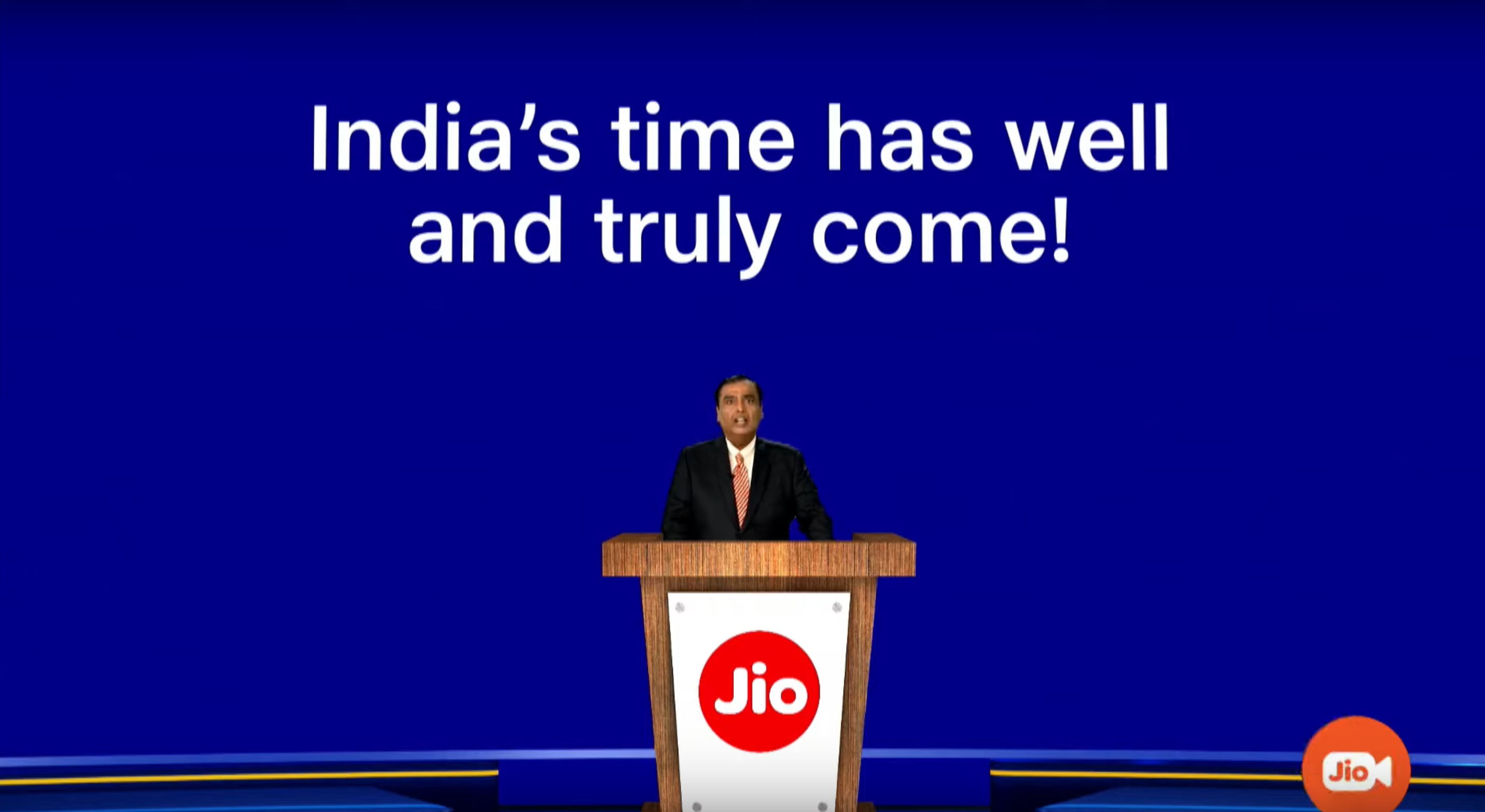Il fermo immagine di una conferenza di Jio a luglio.