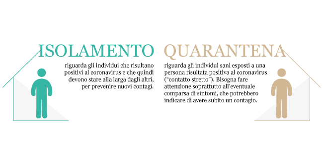La quarantena riguarda invece gli individui sani esposti a una persona risultata positiva al coronavirus (“contatto stretto”). L’individuo esposto deve fare attenzione soprattutto all’eventuale comparsa di sintomi, che potrebbero indicare di avere subìto un contagio.