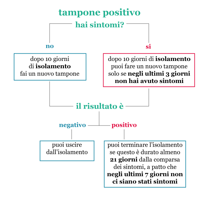 Diversi individui non hanno più sintomi da almeno una settimana, ma continuano a essere positivi al tampone che dovrebbe determinare la fine del loro isolamento. Le nuove regole introdotte a ottobre dal ministero della Salute prevedono che in questo caso si possa terminare l’isolamento se questo è durato almeno 21 giorni dalla comparsa dei sintomi (a patto che negli ultimi 7 giorni non abbia appunto avuto più sintomi).