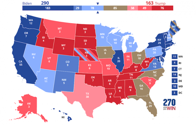 Come sappiamo, però, le elezioni presidenziali americane non vengono decise dal voto nazionale: nel 2016 Hillary Clinton prese oltre 2 punti percentuali in più di Trump, equivalenti a quasi tre milioni di voti. Il vantaggio di Biden è ancora più significativo, ma comunque ad assegnare la presidenza saranno i risultati dei singoli stati, ciascuno dei quali elegge un certo numero di delegati al collegio elettorale sulla base della sua popolazione. La California, saldamente Democratica, ne assegna per esempio 55. Il Wyoming, tradizionalmente Repubblicano, soltanto 3. I delegati sono in tutto 538, il candidato che ne ottiene almeno 270 diventa presidente.