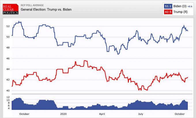 Il vantaggio di Biden a livello nazionale è di 8,6 punti percentuali secondo la media dei sondaggi di RealClearPolitics, ma ci sono singoli sondaggi in cui raggiunge la doppia cifra. È uno scarto nettissimo, che si è ulteriormente ampliato a partire da inizio ottobre, in corrispondenza del primo dibattito e della notizia della positività al coronavirus di Trump, con tutto quello che ne era seguito.