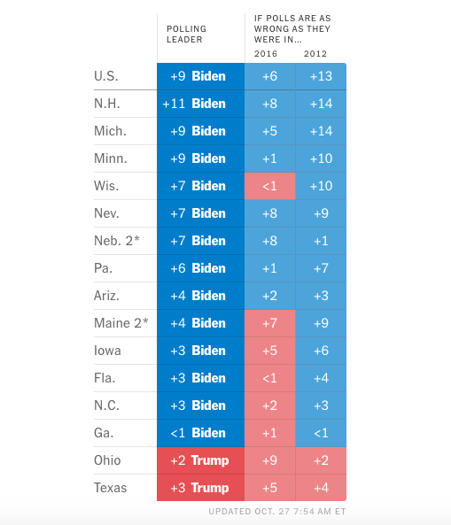 Un grafico del New York Times sulla media dei sondaggi nei principali stati in bilico, e qualche informazione in più: quale sarebbero i dati se i sondaggi sottovalutassero il candidato Repubblicano – come accaduto nel 2016 a Trump – oppure quello Democratico, come capitato a Obama nel 2012