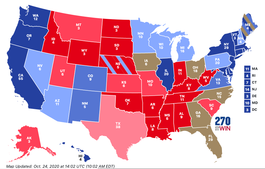(in rosso gli stati in cui Trump è dato in vantaggio secondo gli ultimi sondaggi, in blu quelli in cui è avanti Biden, in grigio gli stati in bilico e il numero di grandi elettori che assegna ciascuno)