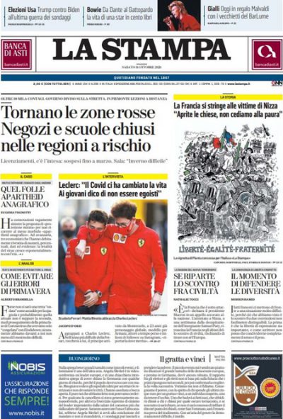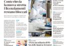 I titoli della maggior parte dei giornali di oggi ipotizzano quali possano essere le nuove chiusure per contrastare la diffusione del coronavirus, dopo la richiesta dell’Istituto Superiore di Sanità di misure immediate in 11 regioni in cui il sistema sanitario è sovraccarico e dopo che il numero dei positivi registrato ieri ha superato i trentamila casi. Il Sole 24 Ore e il Manifesto aprono invece sulla proroga al 21 marzo del blocco dei licenziamenti annunciata ieri dal presidente del Consiglio Conte, mentre Libero chiede le dimissioni della ministra dell’Interno Lamorgese per la vicenda dell’attentatore di Nizza passato dall’Italia.