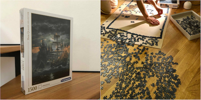 Uno dei numerosi effetti del lockdown di marzo – trascurabile rispetto ai veri problemi di quel periodo, ma reale – è stato che Amazon giustamente consegnava solo beni di prima necessità, tra cui non erano ovviamente compresi i puzzle. E i negozi erano chiusi, e quei pochi siti online esteri che li vendevano erano pieni di ordini e altri guai: il redattore che aveva pensato di passare le serate in famiglia a fare puzzle insomma non aveva avuto un’idea originale, tutt’altro. Ancora non si sa torneremo in lockdown, ma il redattore ha deciso di arrivarci preparato, in caso succeda: dopo una votazione in famiglia per scegliere l’immagine, con 20 euro si è dotato di una Nave dei pirati da 1.500 pezzi.