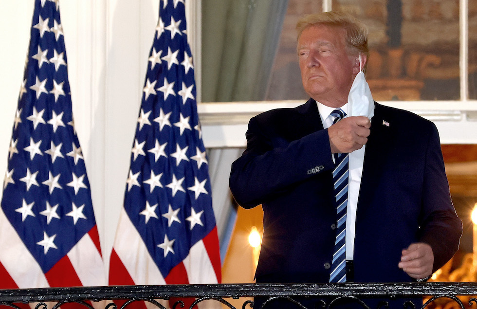 La foto famosa in cui Donald Trump si toglie la mascherina dopo il suo ricovero. (Win McNamee/Getty Images)