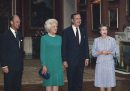 George H. W. Bush con la regina Elisabetta II e il principe Filippo a una partita tra Baltimore Orioles e Oakland Athletics nel 1991 (AP Photo/Greg Gibson)