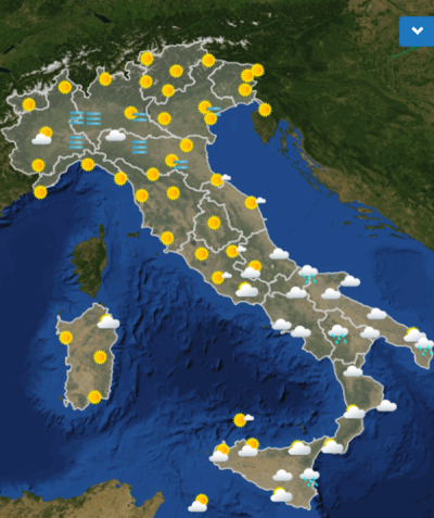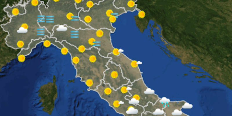 Le previsioni meteo per mercoledì annunciano un inizio di giornata nebbioso che poi si rischiarerà al Nord, bel tempo anche in Sardegna e al Centro, salvo annuvolamenti pomeridiani sulle zone adriatiche, e piogge sulle regioni ioniche; in Campania e in Molise pioverà nelle prime ore del giorno, poi il cielo sarà nuvoloso.