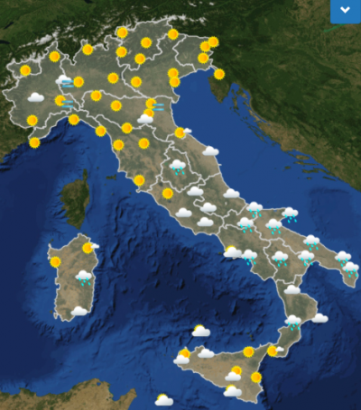 Le previsioni meteo per sabato dicono che in Italia sarà una pessima giornata per il Sud. Di mattina pioverà in Umbria e in molte regioni del Sud: Campania, Puglia, Molise, Basilicata e Calabria. Di pomeriggio pioverà anche in Sardegna e in Sicilia, mentre ci saranno schiarite in Campania, e nel resto del paese sarà perlopiù soleggiato. Di sera e di notte migliorerà, ma continuerà a piovere in Basilicata, in Calabria e in Sicilia. Le temperature caleranno notevolmente in tutta Italia, ma soprattutto al Nord, dove le minime saranno di poco sopra lo zero.