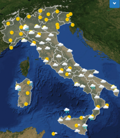 Le previsioni meteo per martedì dicono che in Italia sarà una giornata perlopiù soleggiata al Nord e nuvolosa al Sud: di mattina pioverà in Basilicata, nella zona di Reggio Calabria e nella Sicilia orientale; di pomeriggio smetterà di piovere ma continuerà a essere nuvoloso su gran parte della penisola, con l’eccezione delle regioni settentrionali e della Sardegna. Infine, di sera e di notte la situazione rimarrà più o meno invariata, con piogge previste a Reggio Calabria e a Palermo.