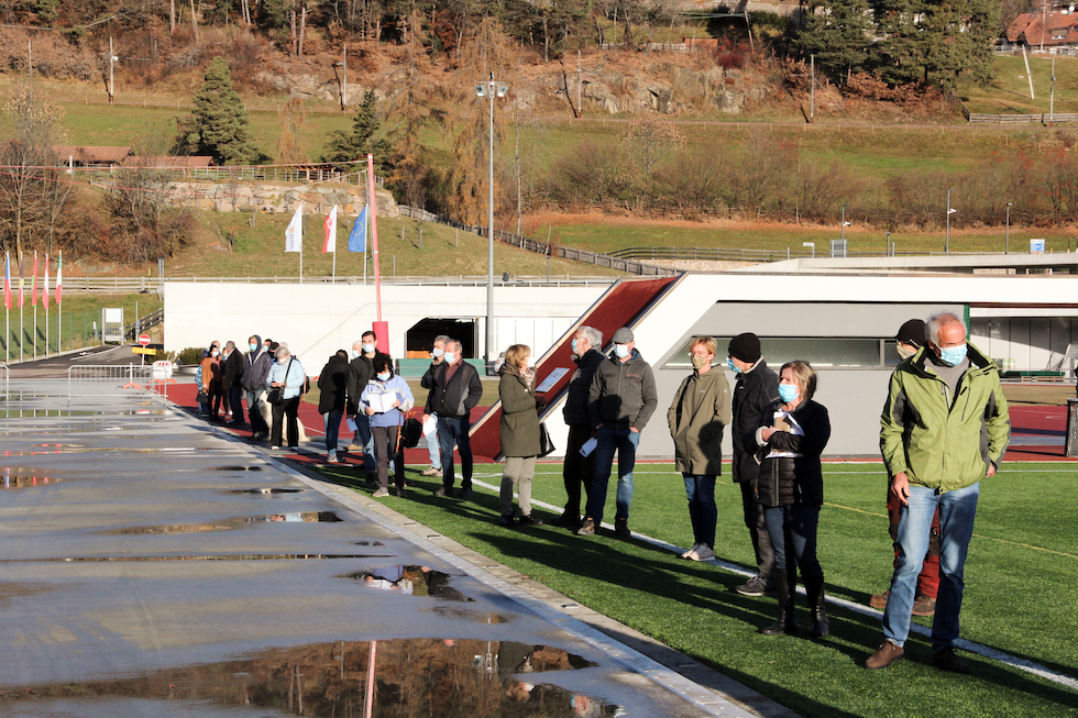 Persone in coda fuori dalla Ritten Arena di Collalbo, provincia di Bolzano (Il Post)