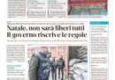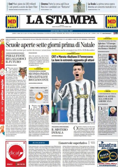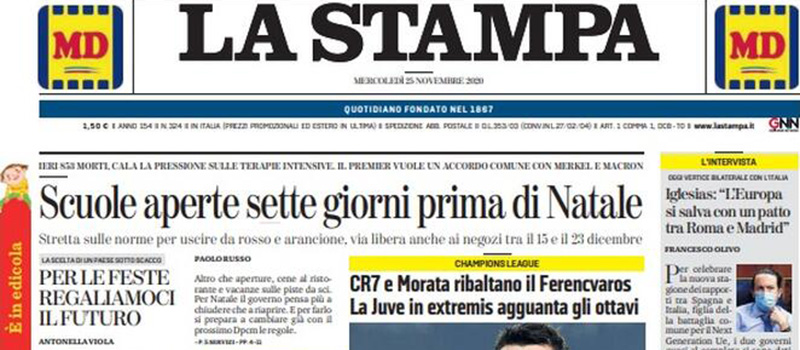 Le notizie principali sul coronavirus in apertura sui giornali di oggi sono le ipotesi sulla riapertura delle scuole a dicembre e sulla chiusura degli impianti sciistici in Italia e negli altri paesi sulle Alpi, le novità sul vaccino, e i dati di ieri su morti e positivi. Qualche giornale apre invece sulla giornata mondiale contro la violenza sulle donne che si celebra oggi, Libero si occupa delle divisioni nel centrodestra, il Giornale critica la gestione da parte del Consiglio Superiore della Magistratura dei procedimenti disciplinari, e i giornali sportivi commentano le vittorie in Champions League di Juventus, che si qualifica già per gli ottavi, e Lazio.