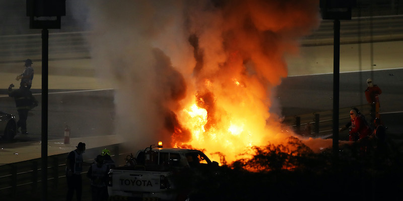 Il Gran Premio di Formula 1 del Bahrain è stato sospeso poco dopo la partenza per un brutto incidente che ha coinvolto la Haas guidata dal pilota francese Romain Grosjean. Dopo le prime curve, l’auto di Grosjean ha avuto un contatto con l’Alpha Tauri di Daniil Kvyat e si è schiantata contro le vicine barriere protettive, spezzandosi in due: ha preso fuoco all’istante ma Grosejan è riuscito incredibilmente ad uscire dalla postazione di guida, anche grazie all’aiuto degli steward. Grosjean si è salvato grazie alla protezione della scocca (rimasta incastrata nel guard-rail), e grazie all’Halo, la staffa che protegge la testa dei piloti installata su tutte le monoposto dal 2018.