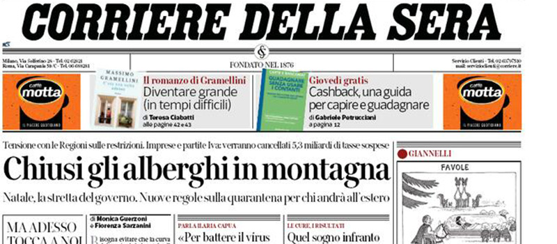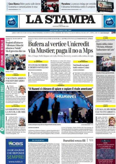 Ci sono notizie diverse in apertura sui giornali di oggi: molti si occupano di quelle sul coronavirus, con le ipotesi sulle restrizioni che dovrebbero essere decise dal governo per il periodo natalizio, l’invito dell’Unione Europea a non consentire la celebrazione di cerimonie religiose in presenza per evitare assembramenti, l’approvazione da parte del governo della riforma del Meccanismo Europeo di Stabilità e i dati sui contagi nelle varie regioni. La Stampa e il Sole 24 Ore aprono invece sull’annuncio dell’amministratore delegato di Unicredit Mustier di voler lasciare l’incarico alla scadenza del suo mandato nel prossimo aprile, e Repubblica titola sull’incontro fra magistrati italiani e egiziani che indagano sulla morte di Giulio Regeni.