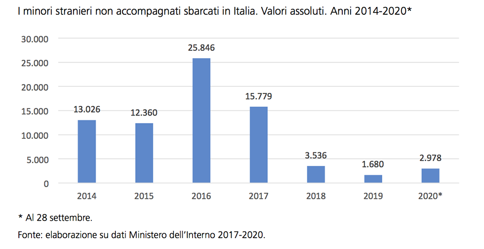 Sono 2.978 i nuovi minori stranieri non accompagnati segnalati in territorio italiano al 28 settembre 2020 (erano stati 6.251 in tutto il 2019). Sono arrivati soprattutto da Bangladesh, Egitto, Albania, Afghanistan e Tunisia. La principale regione di arrivo è la Sicilia (33 per cento del totale), ma seguono due regioni raggiunte via terra attraverso la “rotta balcanica”: il Friuli Venezia Giulia (17 per cento) e la Lombardia (13 per cento).