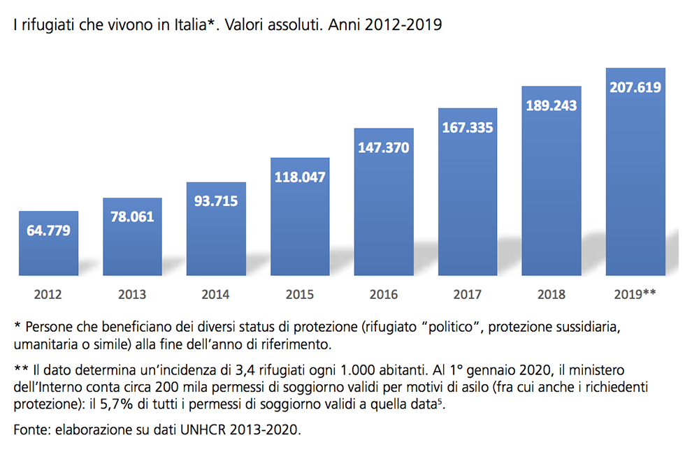 Nei primi sei mesi del 2020, le nuove richieste d’asilo nell’Unione Europea sono state meno di 200 mila: c’entrano le restrizioni e i lockdown conseguenti alla pandemia. In Italia, nei primi otto mesi del 2020 sono stati riconosciuti meno di 5.900 benefici fra status di rifugiato, protezione sussidiaria e protezione speciale: in generale, un richiedente asilo su cinque ha ottenuto uno dei tre riconoscimenti.