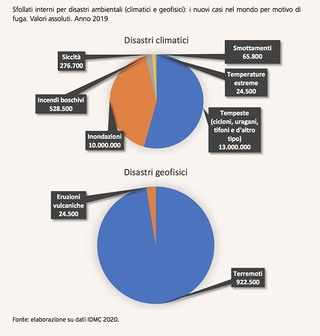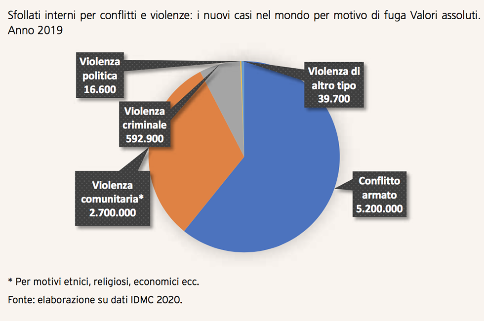 A fine 2019, nel mondo, le persone costrette a fuggire da guerre o persecuzioni che sono rimaste all’interno del paese di origine sono più di 50 milioni: 45,7 per conflitti o violenze (il peggior dato di sempre) e 5,1 per disastri ambientali. Sono 8,5 milioni i nuovi sfollati riferiti al solo 2019 a causa di conflitti e violenze.
