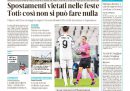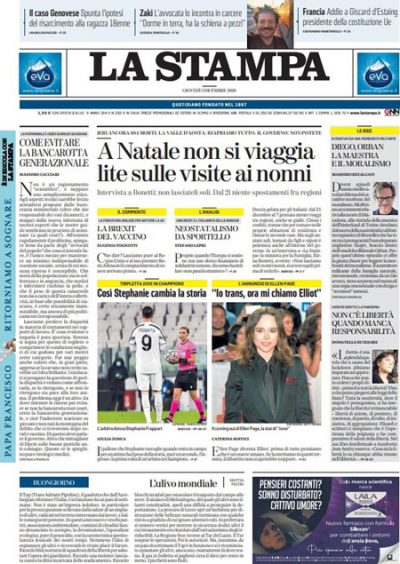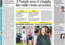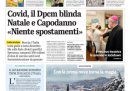 Le anticipazioni sul DPCM con le modifiche alle restrizioni per il periodo natalizio, sul quale ci sono ancora discussioni nella maggioranza di governo, sono in apertura su quasi tutti i giornali di oggi, che concordano sulla chiusura agli spostamenti fra regioni dal 21 dicembre al 6 gennaio. Repubblica e Domani titolano invece sulle divisioni nel Movimento 5 Stelle sulla riforma del Meccanismo Europeo di Stabilità, con la lettera di una cinquantina di parlamentari contrari al provvedimento, Avvenire, il Fatto e Libero si occupano del vaccino per il coronavirus, con l’approvazione nel Regno Unito di quello di Pfizer-BioNTech e il piano italiano presentato dal ministro della Salute Speranza, mentre i giornali sportivi commentano la vittoria della Juventus e il pareggio della Lazio in Champions League.