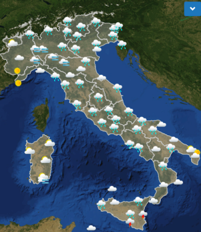 Sarà una domenica molto nuvolosa in tutto il settentrione ma non pioverà sul Nord Ovest e sulle zone occidentali di Lombardia ed Emilia-Romagna; nevicherà a quote superiori ai 1.200-1.500 metri. Al Centro sarà nuvoloso e pioverà, soprattutto su basso Lazio e Abruzzo nella prima parte della giornata; ci saranno schiarite in serata. La Sardegna sarà nuvolosa ma con poche piogge. In tutto il Sud ci saranno temporali: intensi su Sicilia occidentale, Calabria ionica, zone tirreniche e, nel pomeriggio, anche su Basilicata ionica e Puglia meridionale. Anche qui il tempo diventerà più sereno in serata, soprattutto su Molise e Puglia settentrionale.